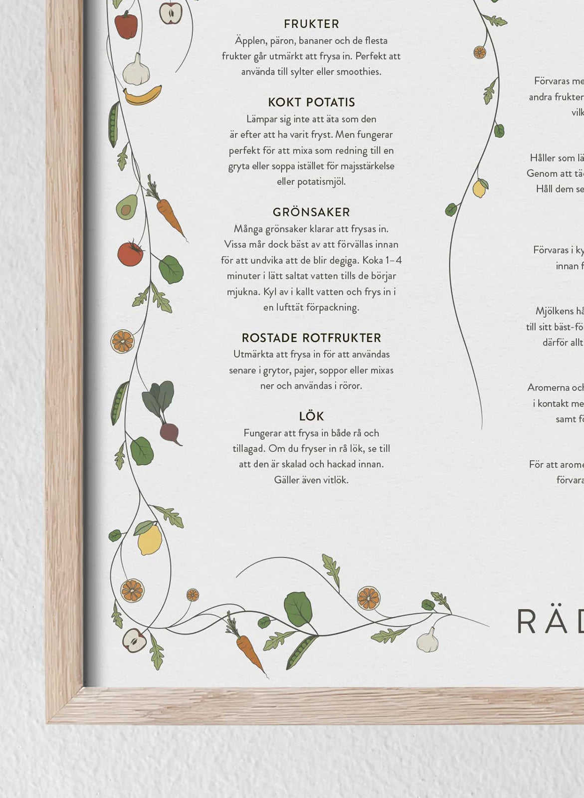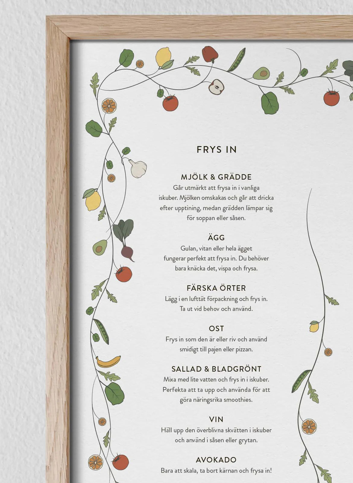 Frys in, förvara rätt och ta till vara är några av tipsen på denna tavla. Med sin stilrena design är tavlan både en fin och praktiskt kökstavla.