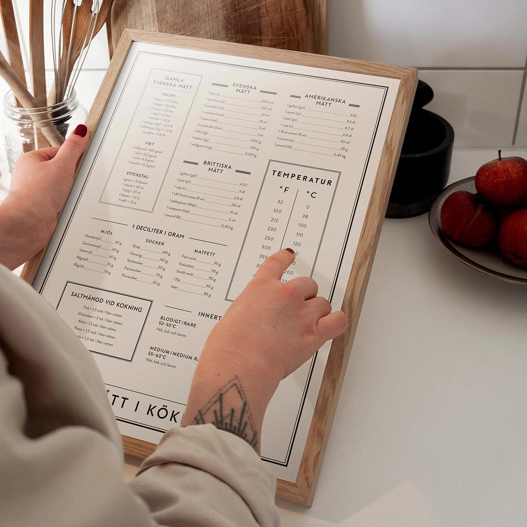 Hos Kunskapstavlan® hittar du tavlor med måttenheter, husmorsknep, men även en kökstavla med innertemperaturer, kryddväxter eller glas. Dessutom har vi lyft ut våra populära tavlor och posters till köket och gjort dem till Mini prints i A5. Fyll ut en befintlig tavelvägg, pryd kylskåpet, dekorera skafferiet eller skapa en egen tavelvägg av köksposters. Vill du ha tips på hur du kan hänga upp dina kökstavlor, besök vår Instagram för inspirerande bilder. Tagga gärna ditt köp med #Kunskapstavlan så vi får se hur du dekorerar ditt hem.