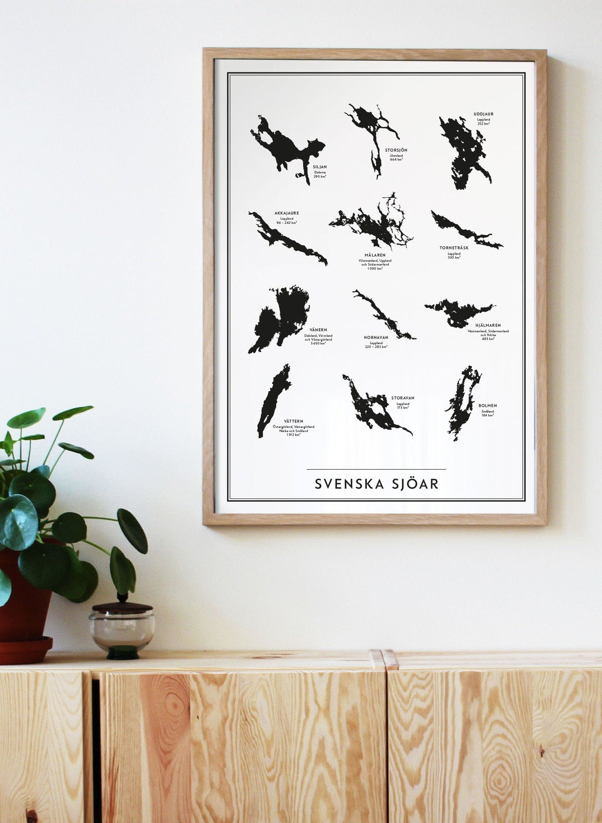 Sveriges 12 största sjöar illustrerade i tidlösa siluetter. Vad tycker du Siljan ser ut som? Här hittar du Vänern, Vättern, Bolmen och många fler av de svenska sjöarna. Dessa illustrerade med svart färg på en vit bakgrund. Häng upp postern på kontoret, i hallen, vardagsrummet eller sovrummet. En perfekt affisch från Kunskapstavlan® att ge bort i present.