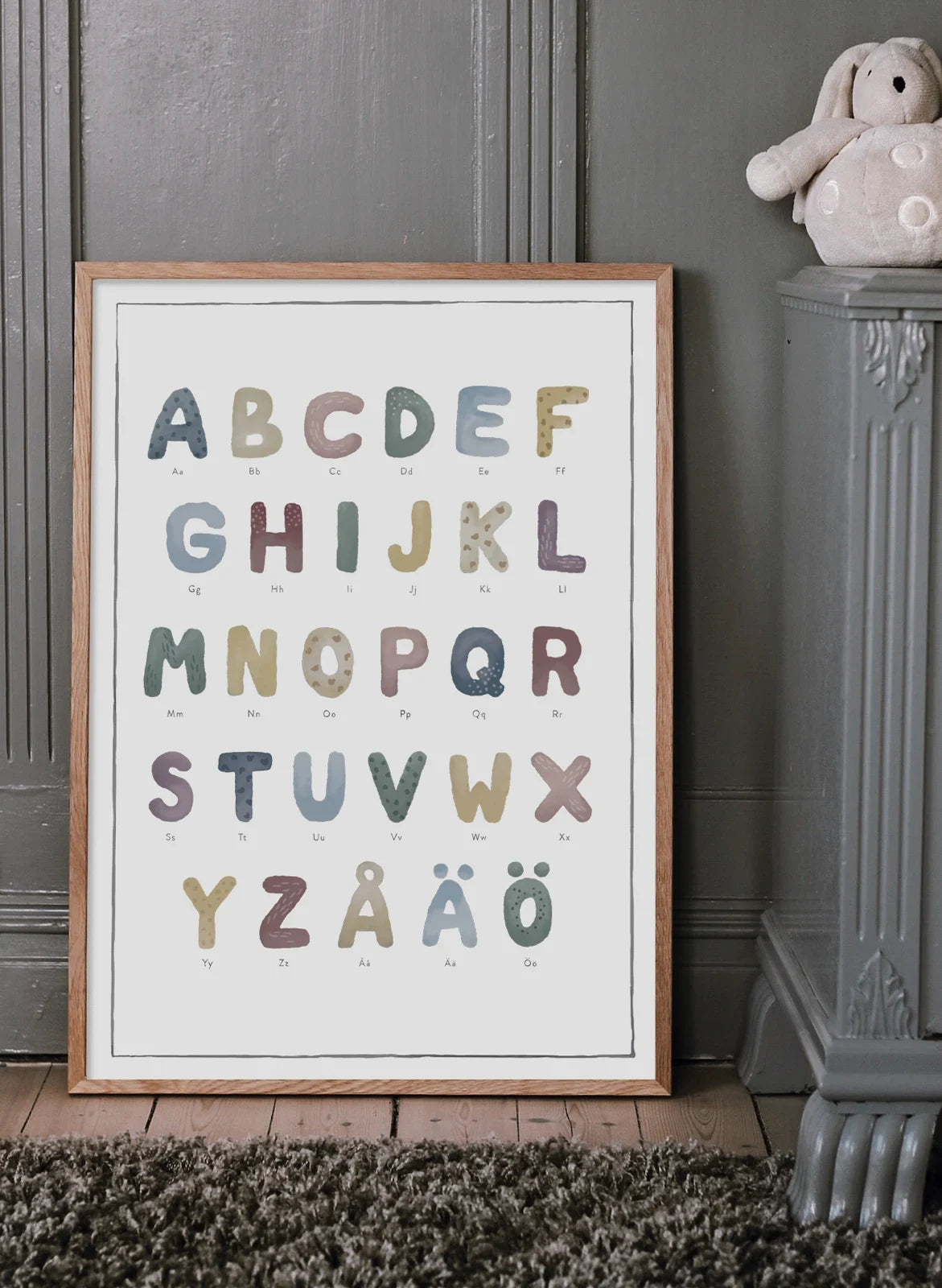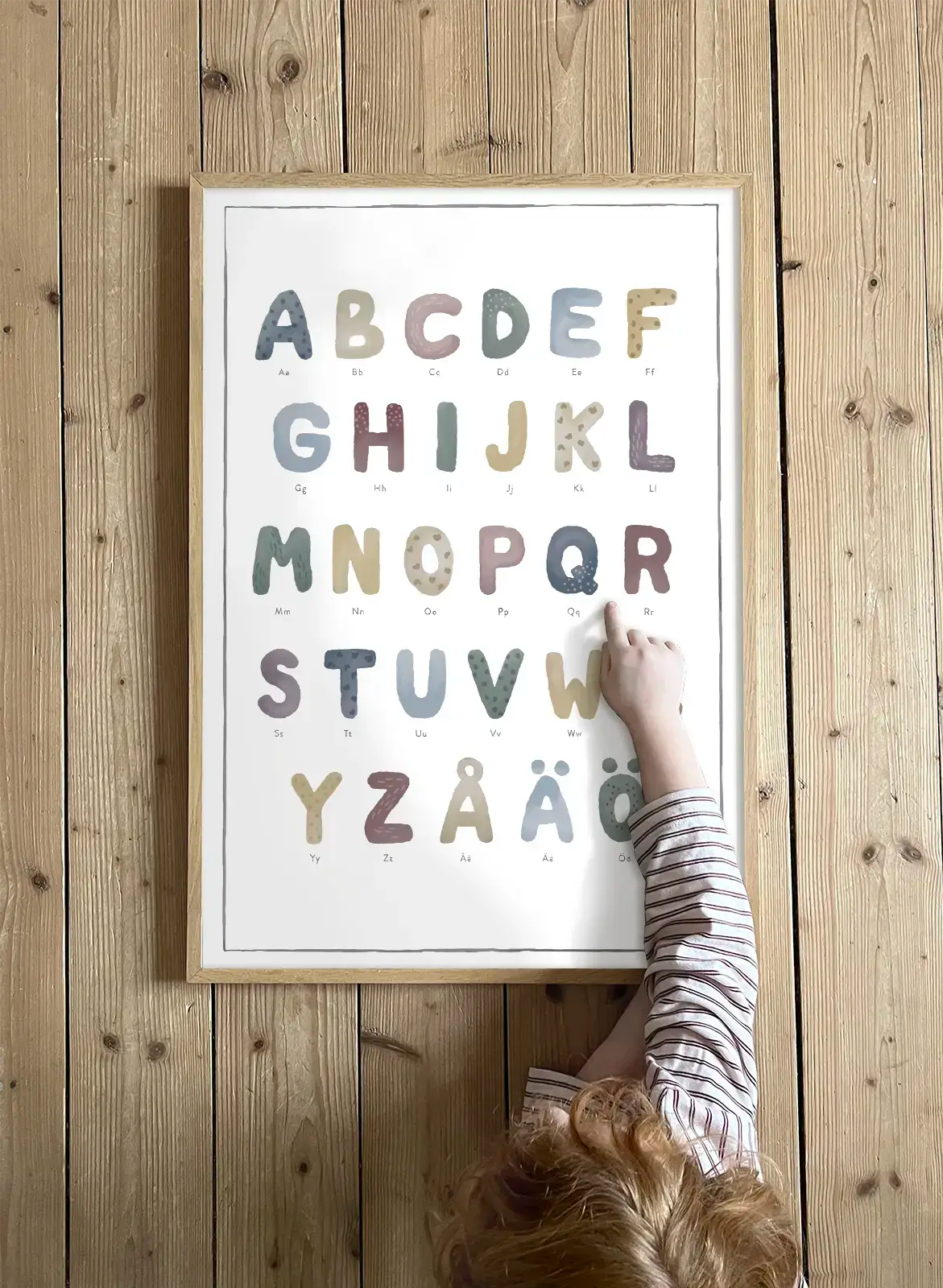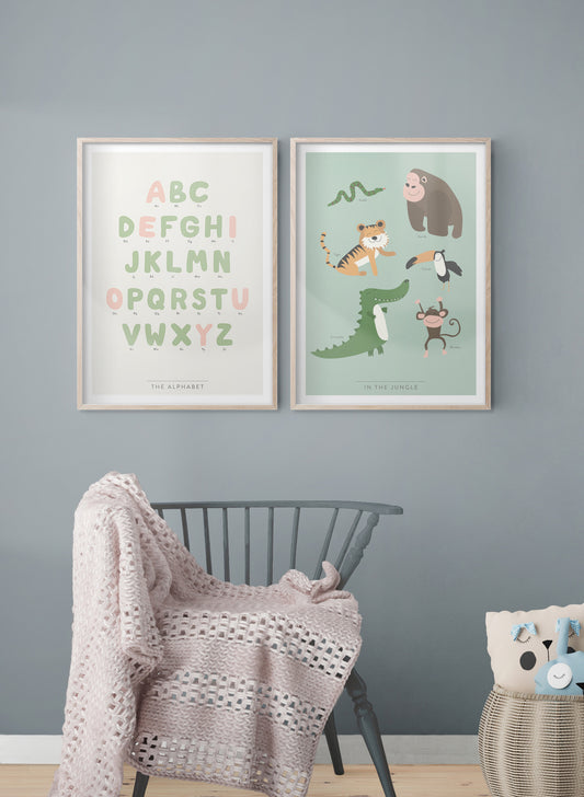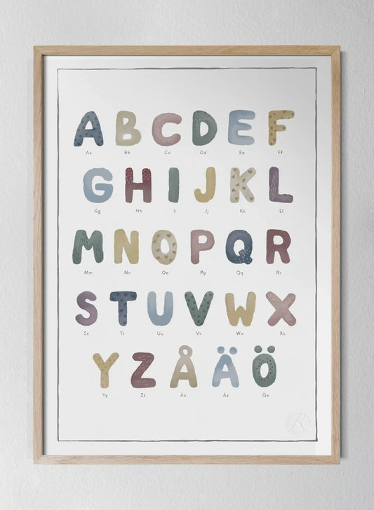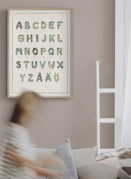 En vacker resa genom bokstäverna. Lär dig alfabetet på ett harmoniskt och inspirerande sätt med vår tavla "Alfabetet". Varje bokstav är illustrerad i mjuka, dova akvarelltoner som skapar ett lugnt och tilltalande uttryck. Gör lärandet lekande lätt i barnrummet!