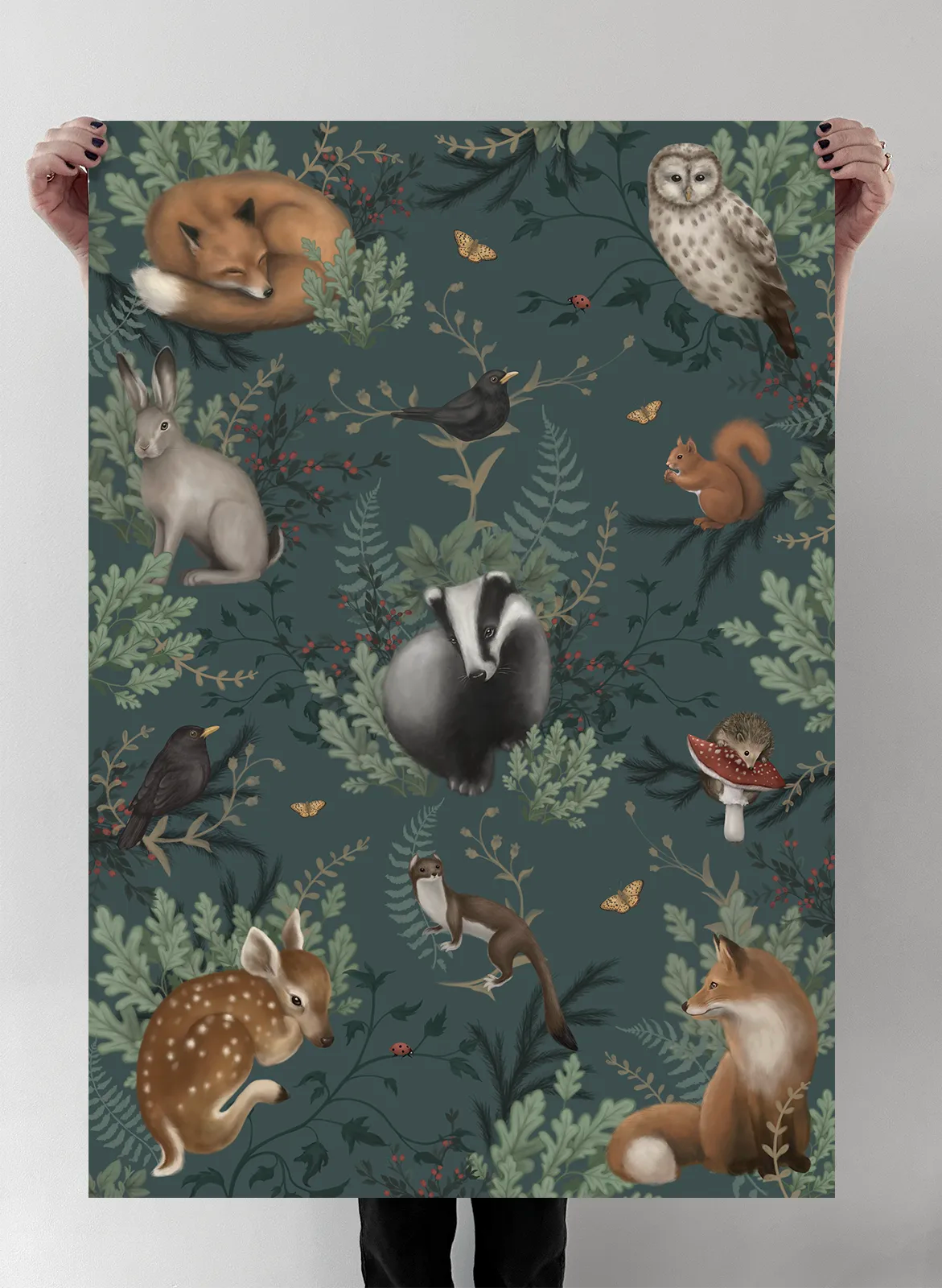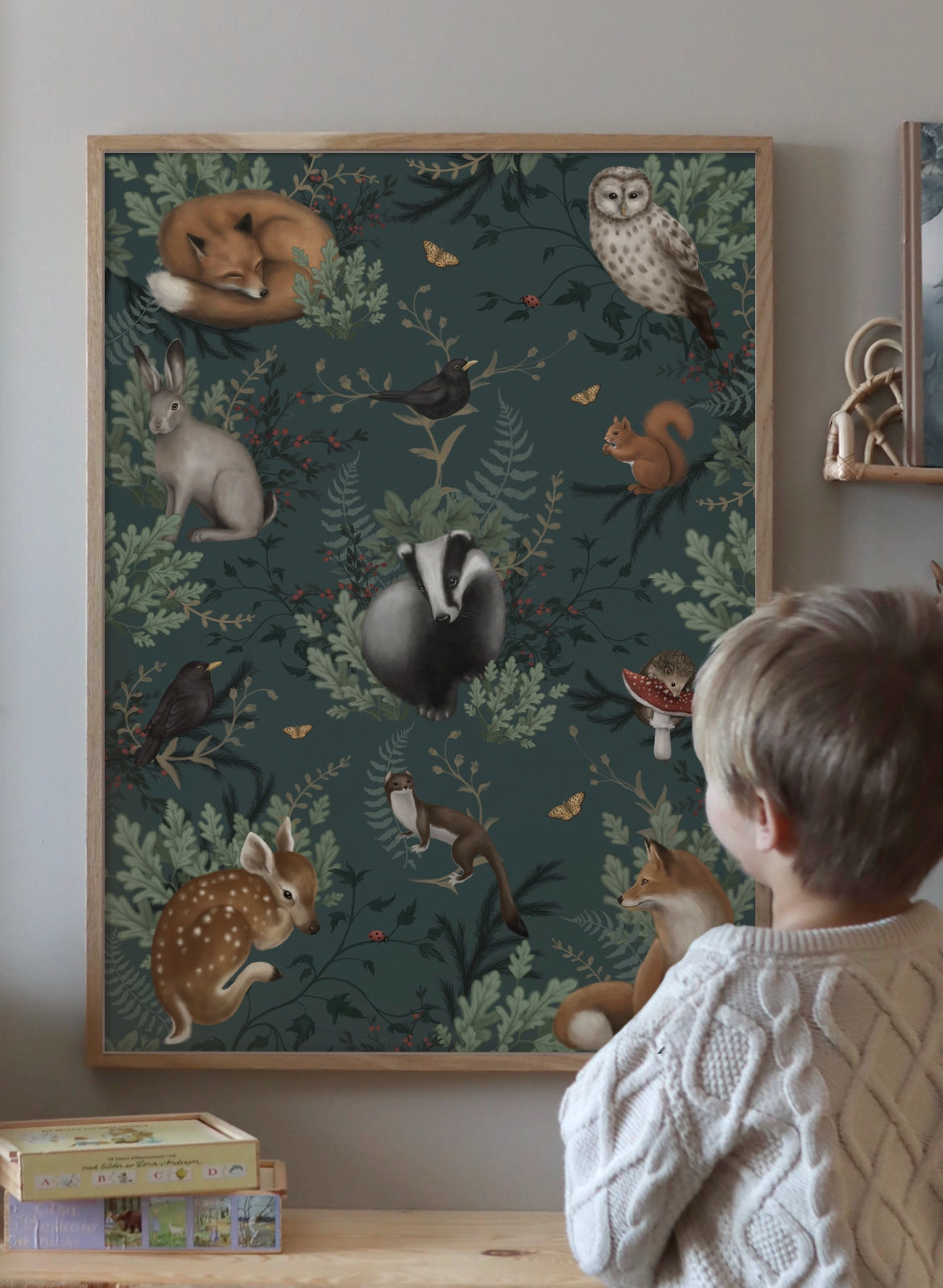 Med varsamma penseldrag och ett mjukt, dovt och varmt färgspel har vi fångat skogens stillhet i varje detalj. Calming Woods blir mer än en tavla – den blir en trygg plats där ditt barn kan vila blicken, känna lugn och fylla på med ny energi.