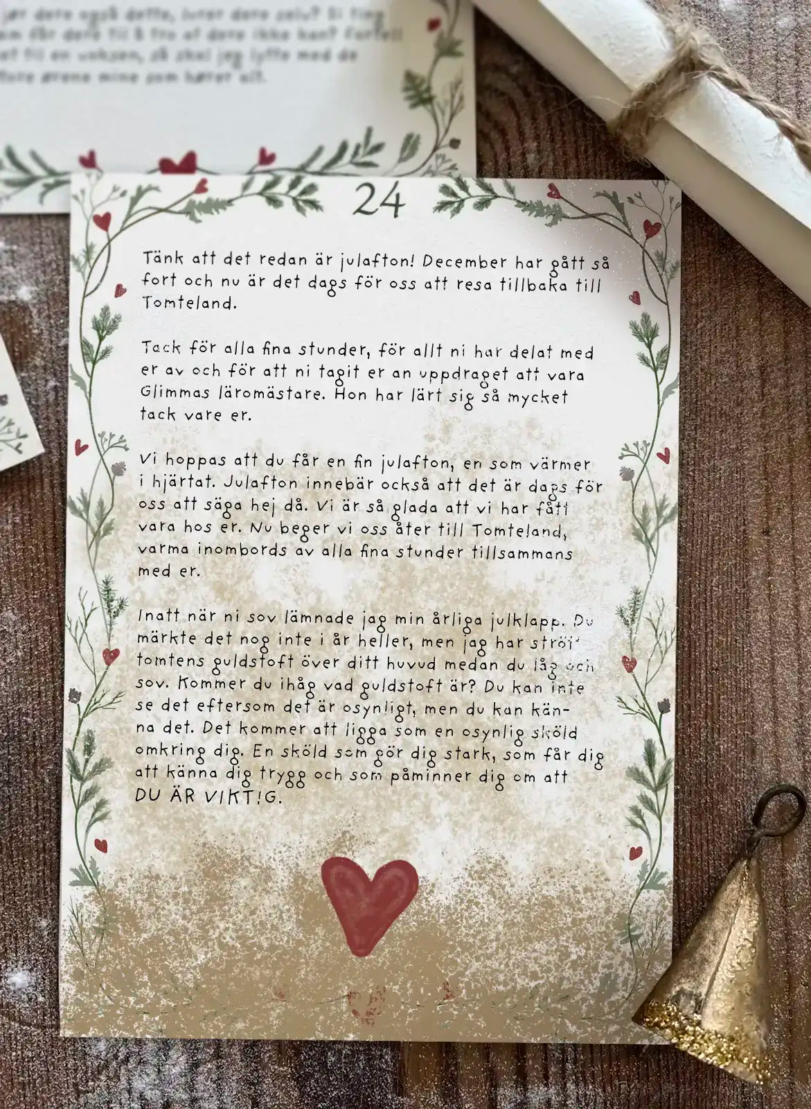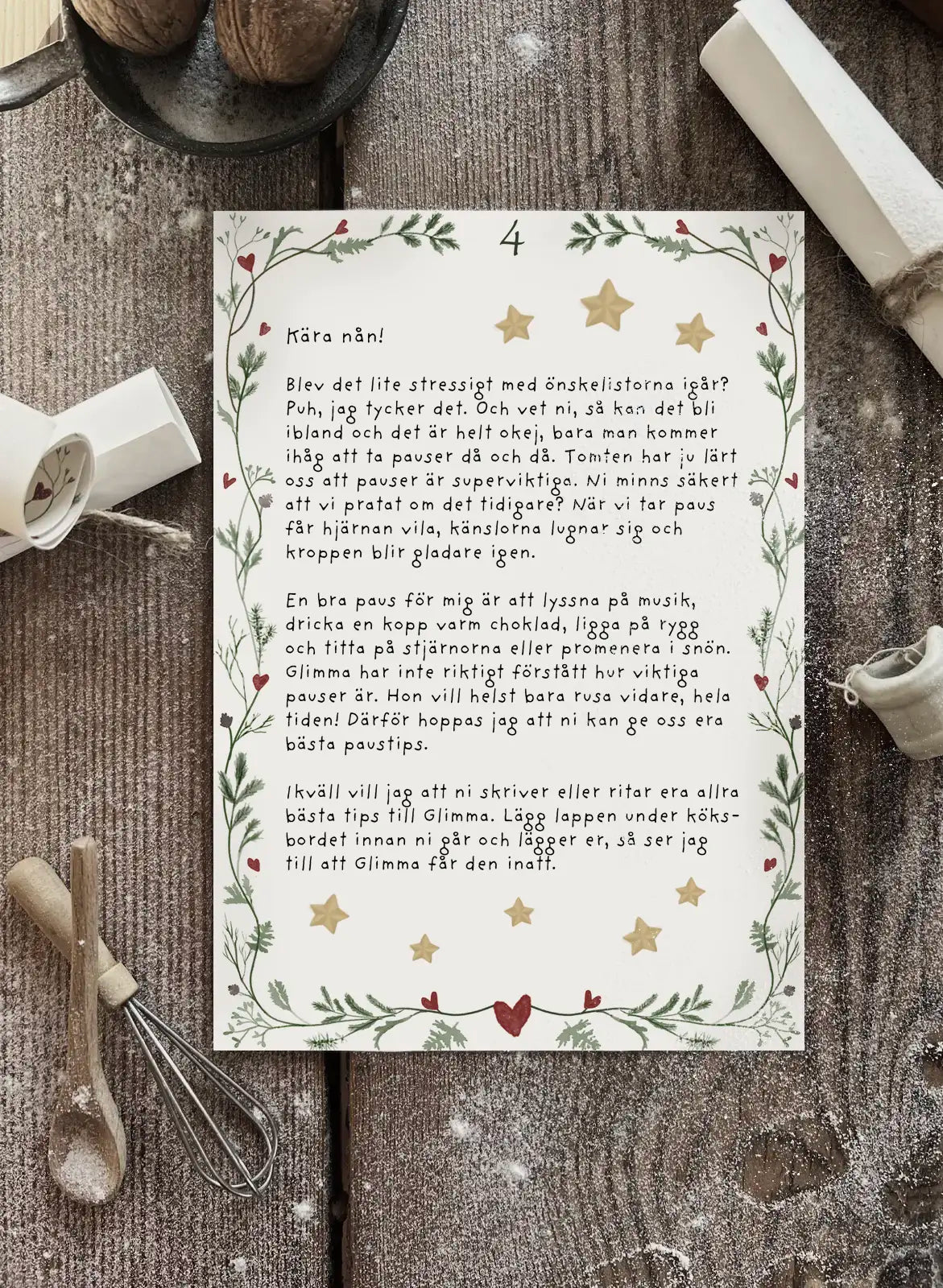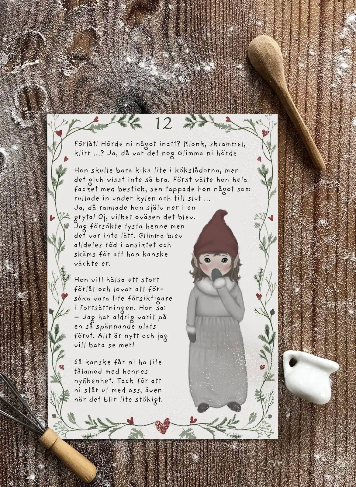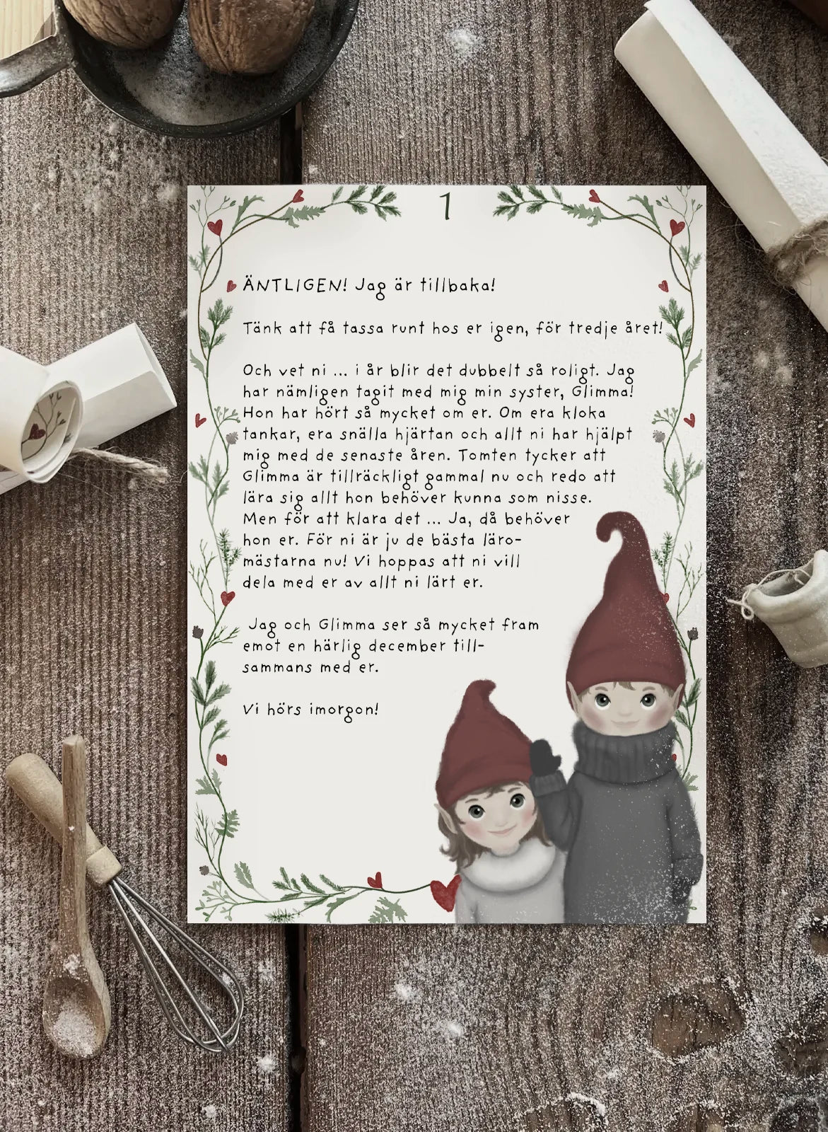 Precis som tidigare blandas värme, skratt och magi – men i år med nya äventyr och en liten extra dimension. Två små tavlor, skapade av nissen, skickas med kalendern som viktiga påminnelser: Lärlyckande-tavlan och Du är bäst på att vara du-tavlan.