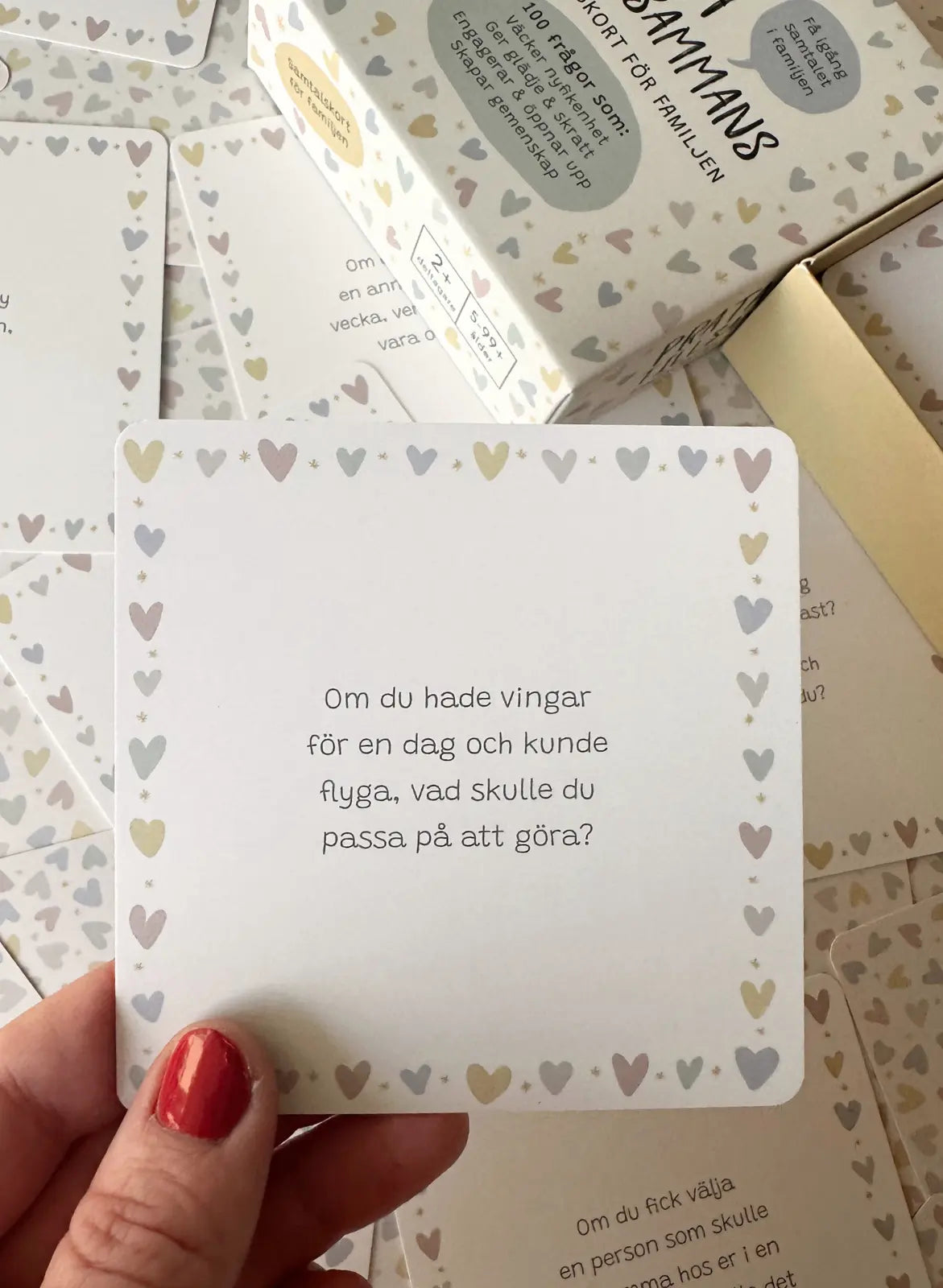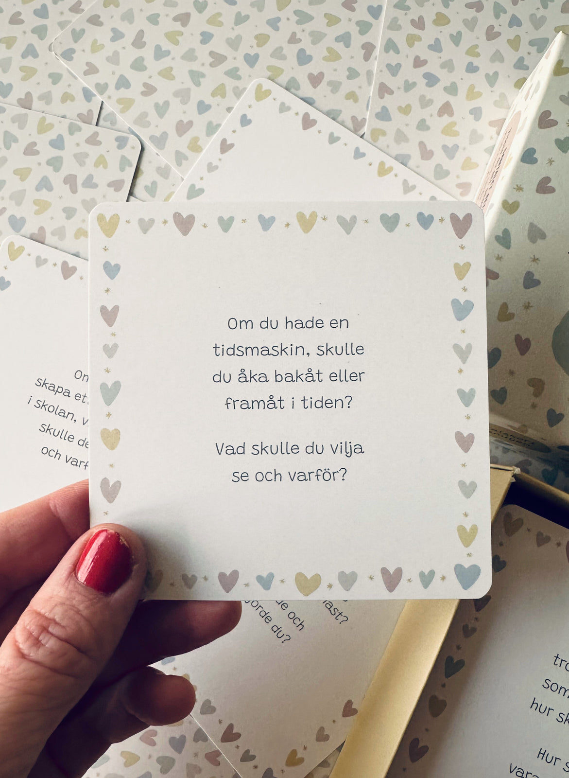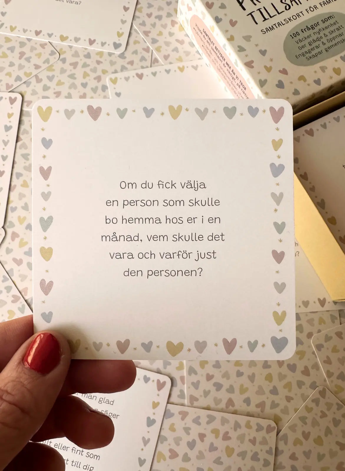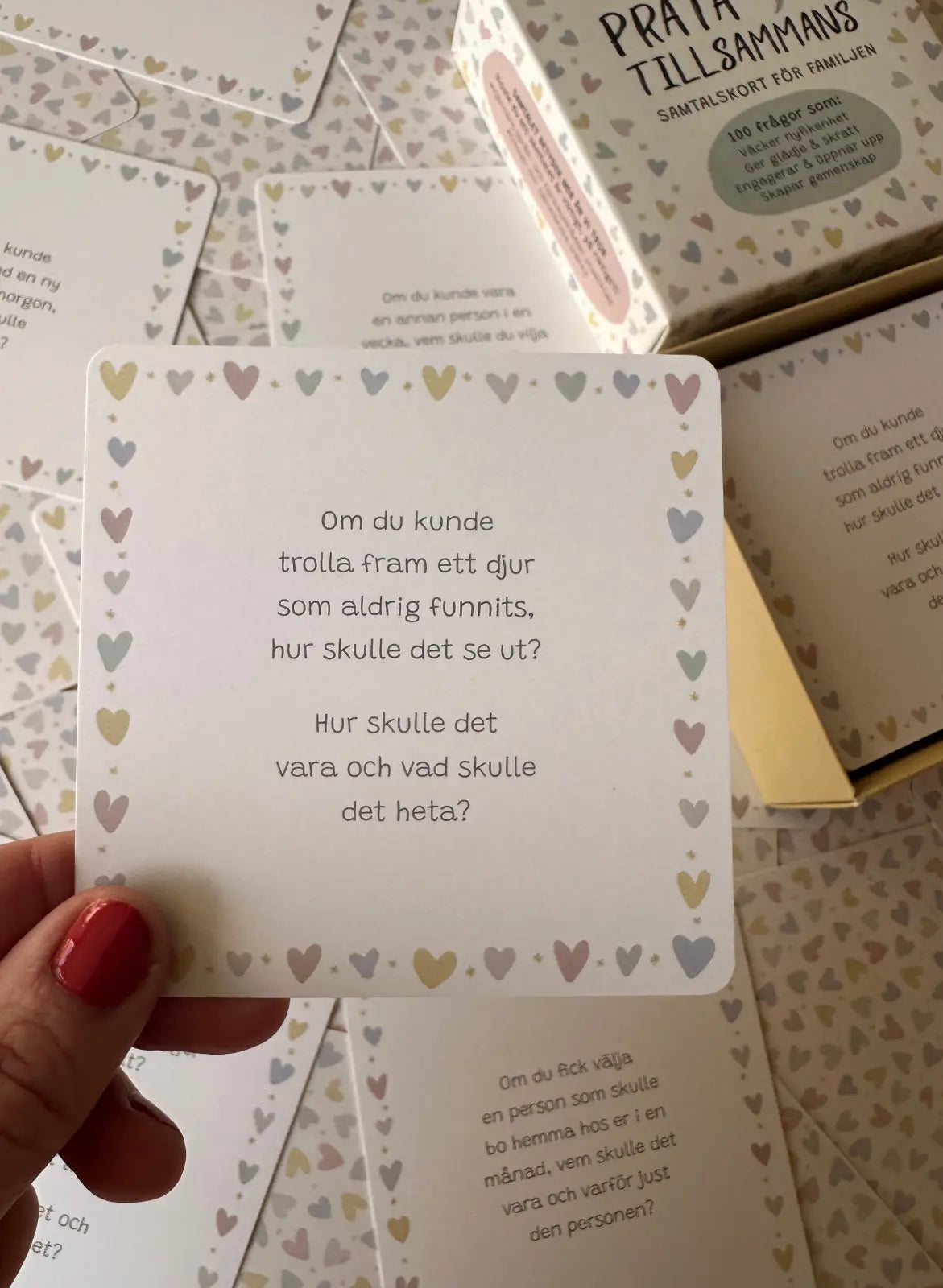 Samtalskorten gör det enkelt att hitta tillbaka till de värdefulla samtalen. 100 frågor som väcker nyfikenhet, skratt och gemenskap – utan att det känns tillgjort eller svårt.
