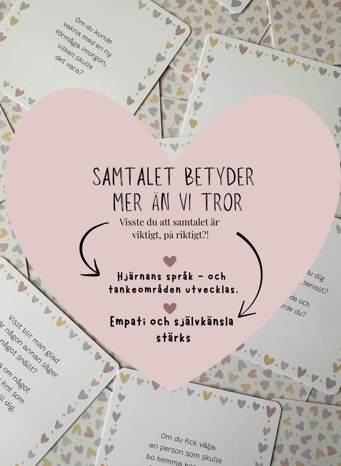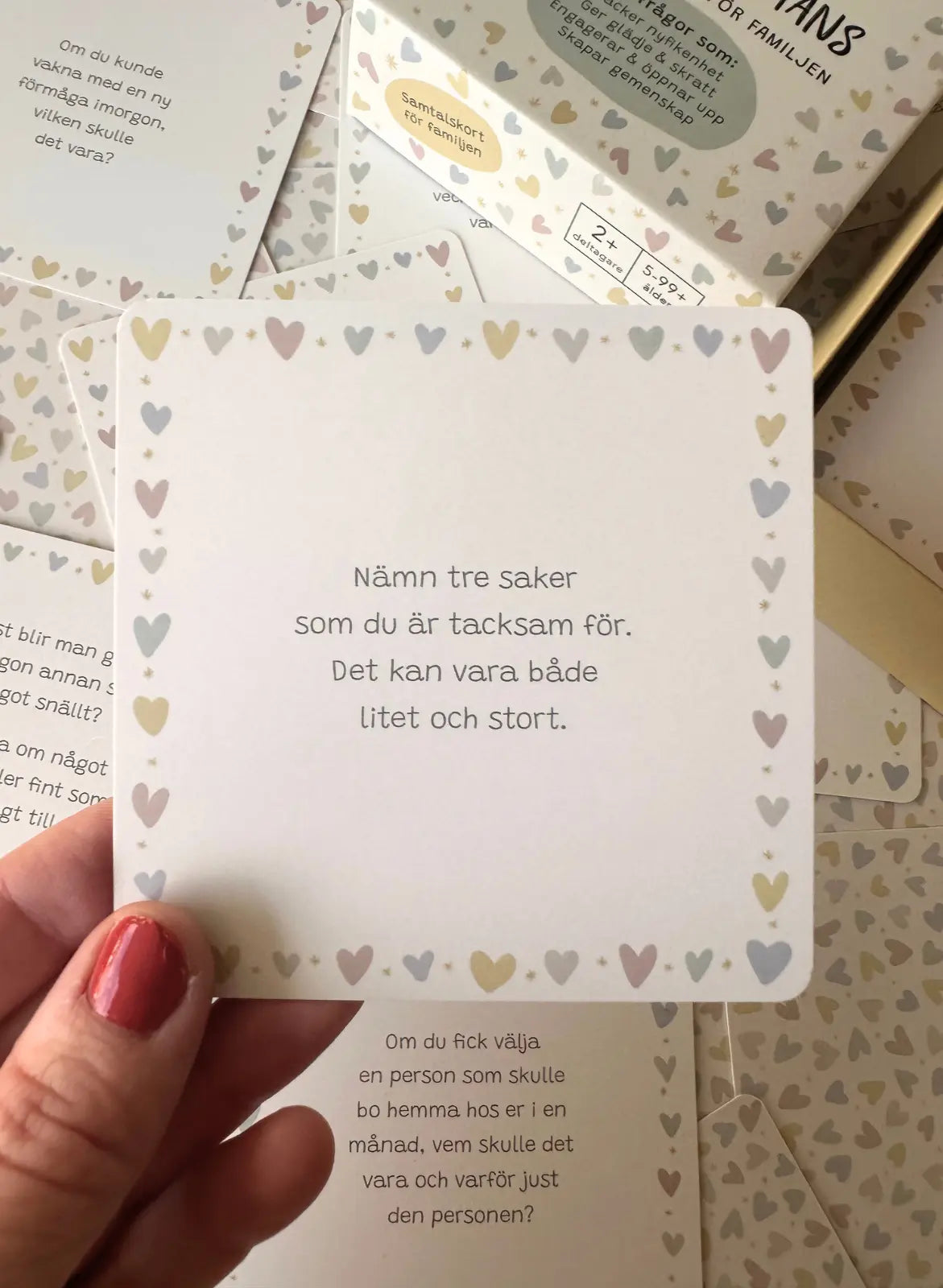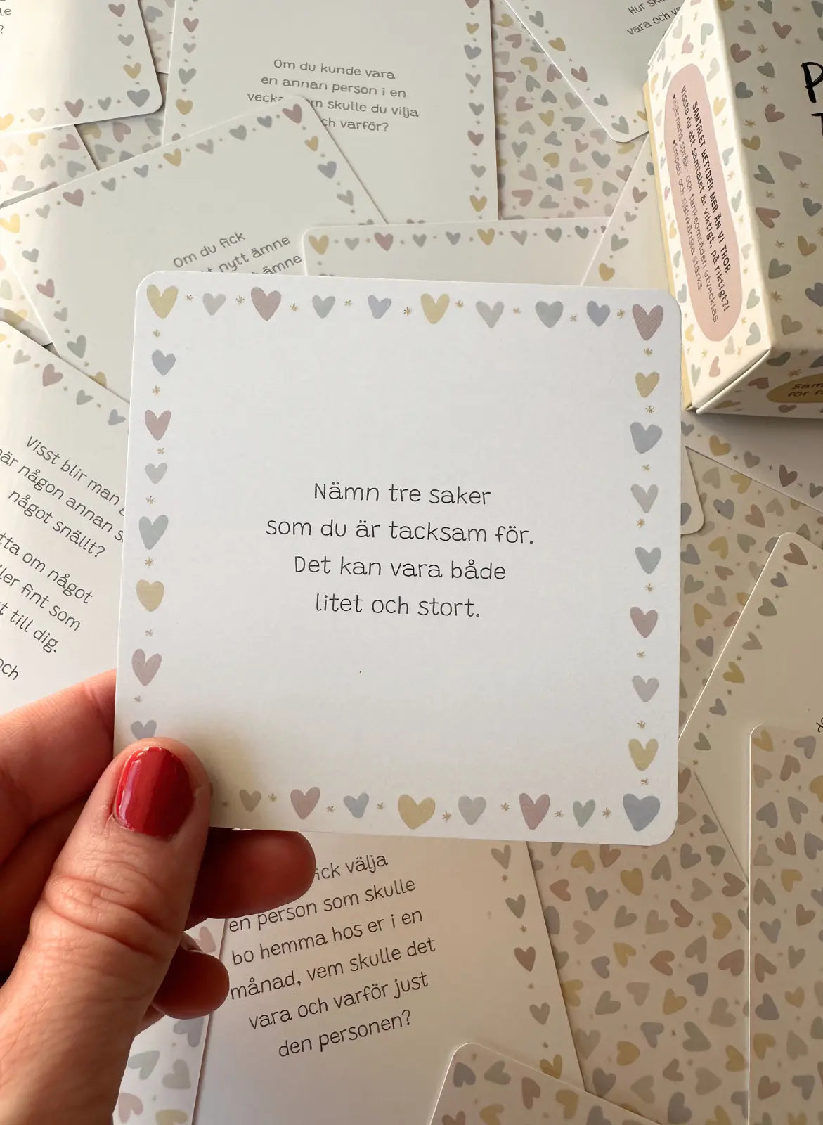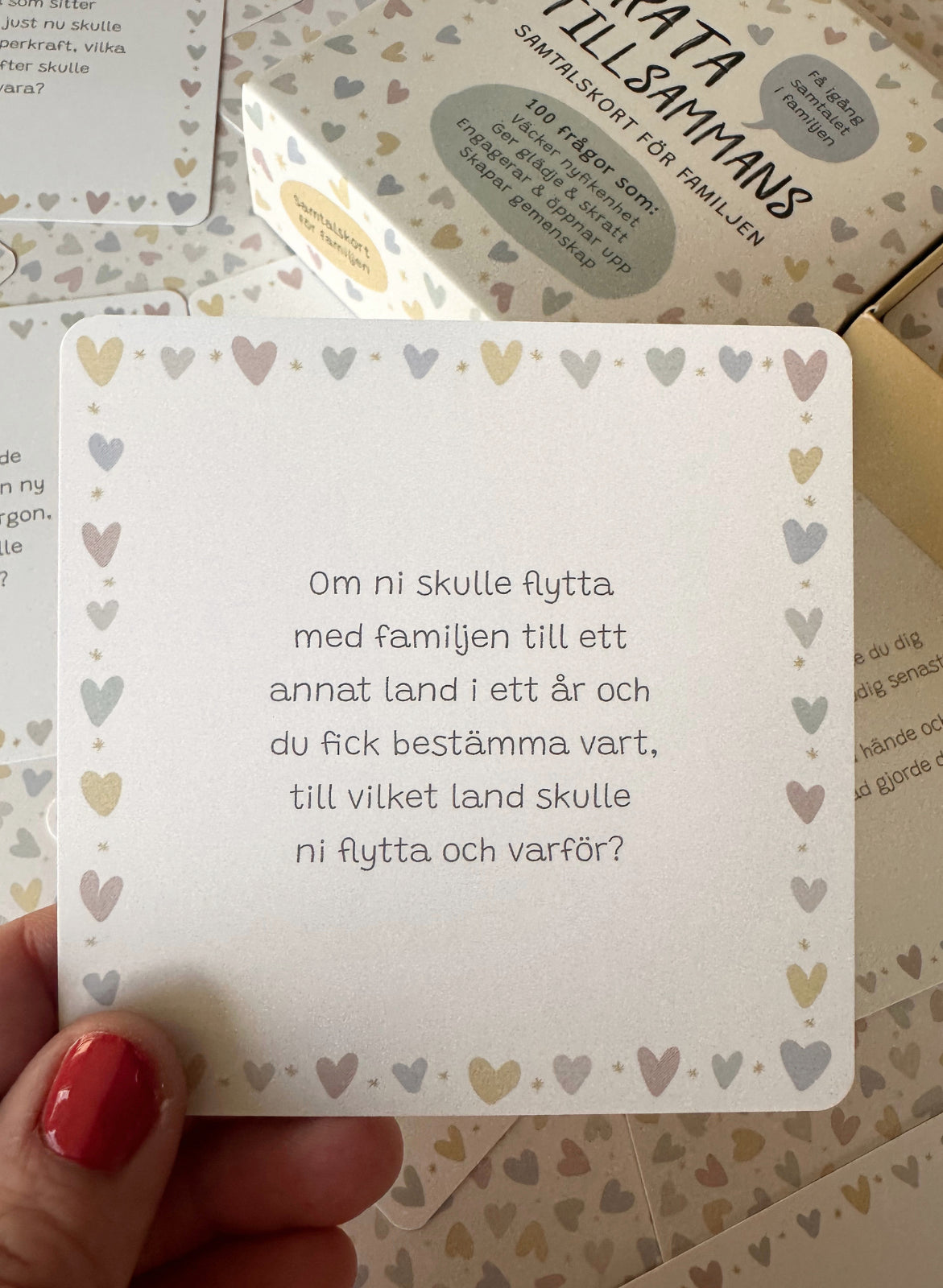 Samtalskorten gör det enkelt att hitta tillbaka till de värdefulla samtalen. 100 frågor som väcker nyfikenhet, skratt och gemenskap – utan att det känns tillgjort eller svårt.
