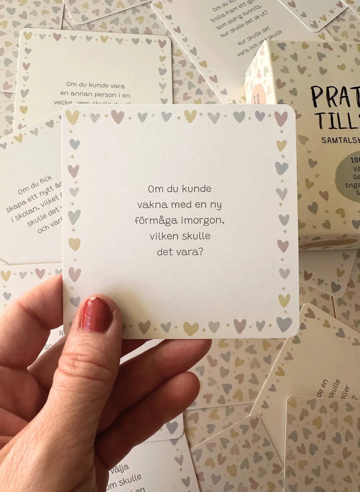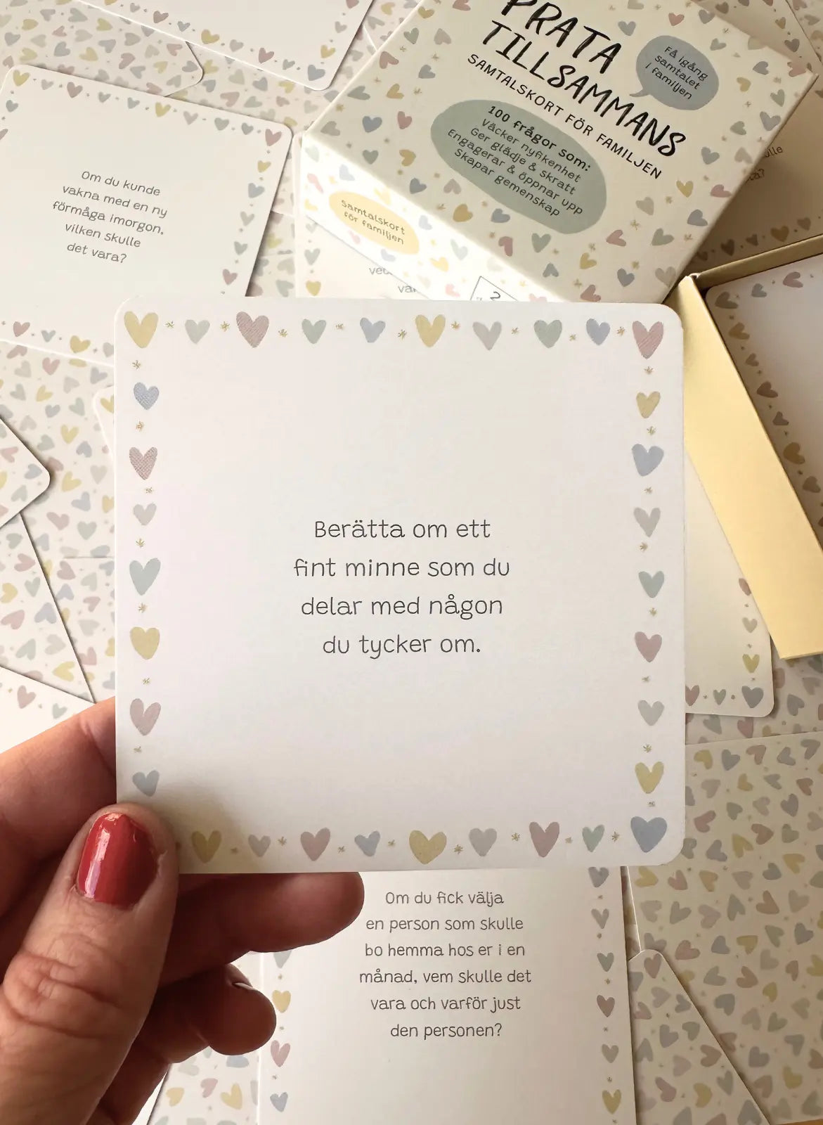 Stäng av TV:n, lägg undan mobilen och var tillsammans – på riktigt. PRATA TILLSAMMANS passar lika bra vid middagsbordet, som på resande fot eller i soffan en helt vanlig vardag.